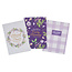 A whitewashed plank background is decorated with a lovely purple floral wreath on the front cover of the first notebook. The sentiment is encircled by the wreath and is presented in gold-foiled lettering.Â