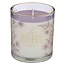 The candle is poured into a clear glass jar with a gold rim and a white label on the front. The label is edged in delicate purple flowers that accent the gold-foiled title in the middle.
