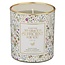 The glass jar is wrapped in a wildflower lattice tapestry with florals in muted tones of pink, lavender, and green set against a white background. A white frame on the front is edged in gold foil and displays the gold-foiled sentiment.