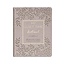 The My Quiet Time Devotional takes women through a 365-day journey into a deeper relationship with God. The cappuccino-colored faux leather devotional offers devotional readings from the New Testament, Scripture meditation, and heartfelt prayer to bring you to a place of rest and refreshment.  The front cover is embellished with a heat debossed leaf design that runs along the top and bottom of the front cover.  The gold foiled title is placed in the center of the design surrounded by a gold foiled frame. The heat debossed subtitle appears below the title in the frame.