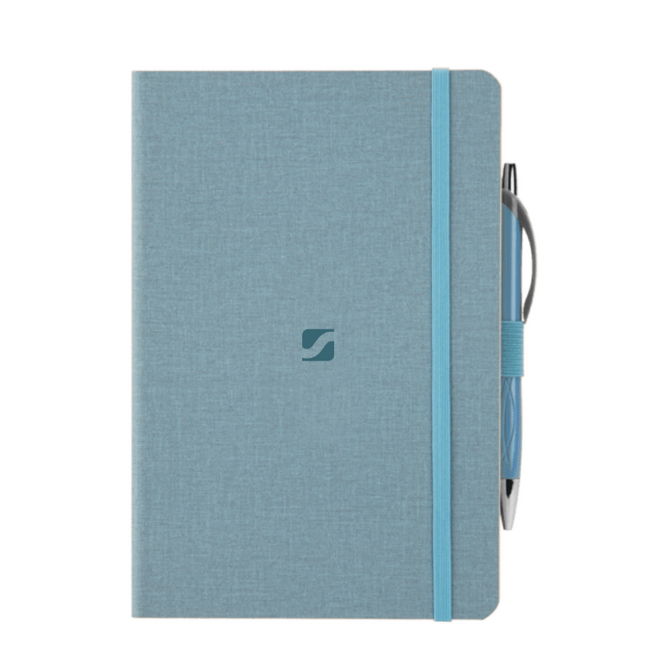 Soft bound 80 sheet lined notebook with crosshatch PU cover and color matched elastic bookmark, pen loop and patterned pen.