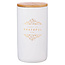 The smooth white ceramic gratitude jar is topped with a tightfitting bamboo lid with a silicone seal. The sentiment is gold foiled on the front of the jar.