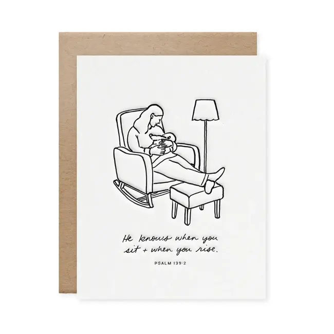 This letterpress printed card combines the truth of God’s Word in Psalm 139:2 with a scene common to mothers in the throw of babies that wake and feed throughout the night. The constant sitting and rising to comfort your baby throughout the day and wee hours of the night is enough to make any mom feel discouraged and unseen in their hard work. Our prayer is that this Bible verse would remind them that each moment of sitting and rising is fully seen and known by God! Give this card as a Mother’s Day card for any mom in this season, or keep it on hand to encourage a mom any time of year.